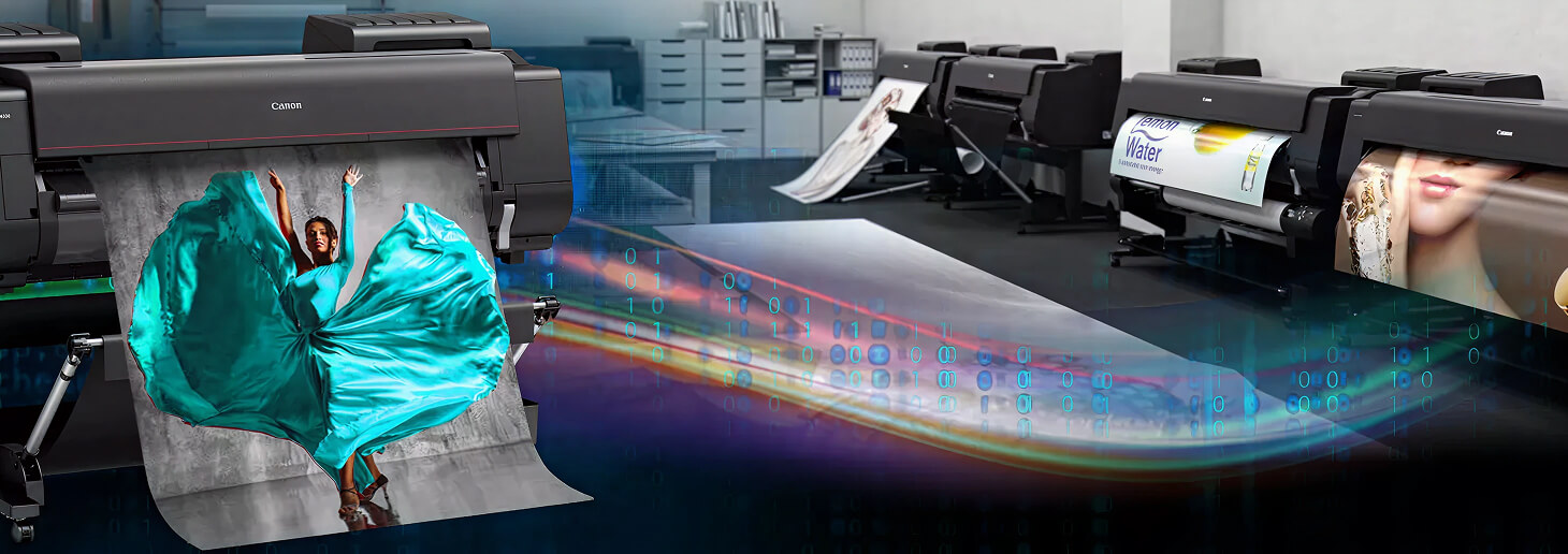 Canon large format devices can handle media up to 24”, 36”, or 44”+ wide depending on model — ideal for posters, plans, and banners.